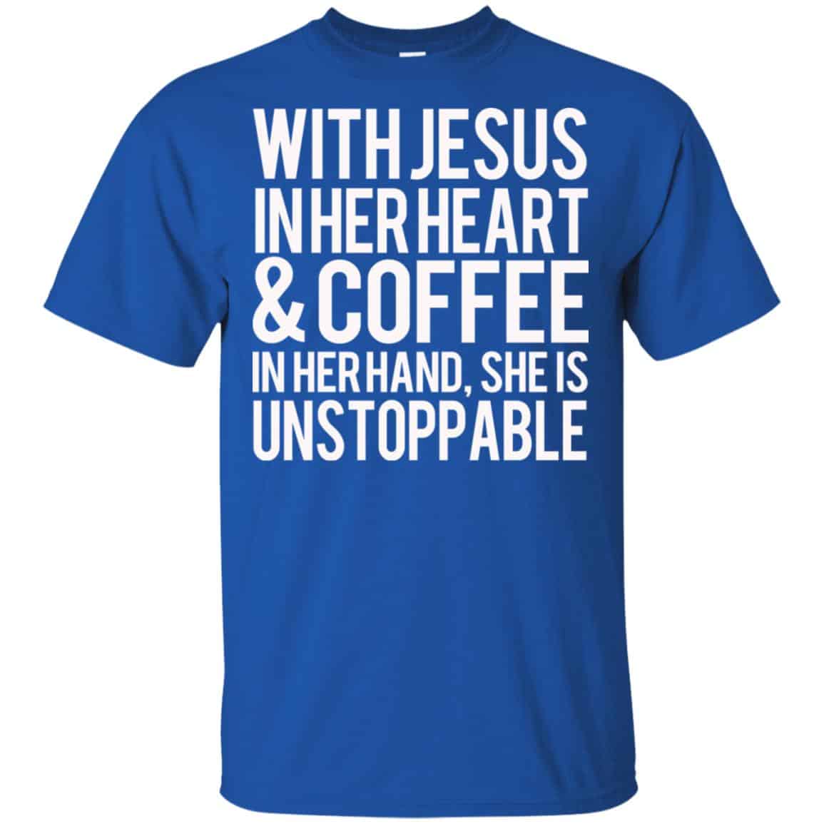 With Jesus In Her Heart & Coffee In Her Hand She Is Unstoppable T-Shirts, Hoodie, Tank